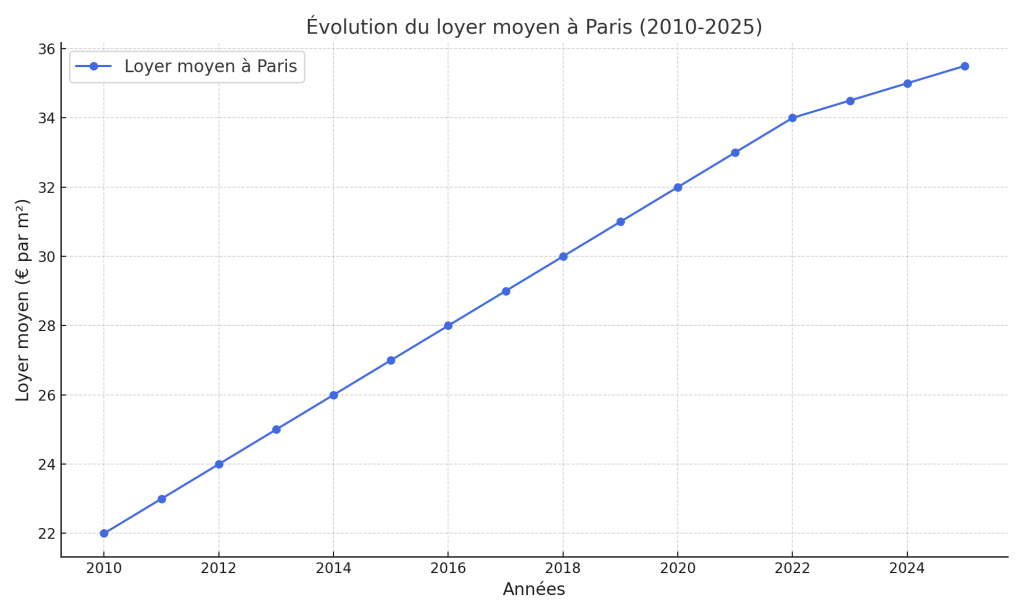 Graphique illustratif : Évolution du loyer moyen à Paris (2010-2025)